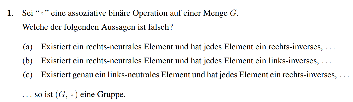 (c) Richtig, wir beweisen die Aussage. Wir wollen zeigen, dass jedes Element auch ein links-Inverses besitzt. Angenommen für gilt . Dann folgt für ein beiebiges :