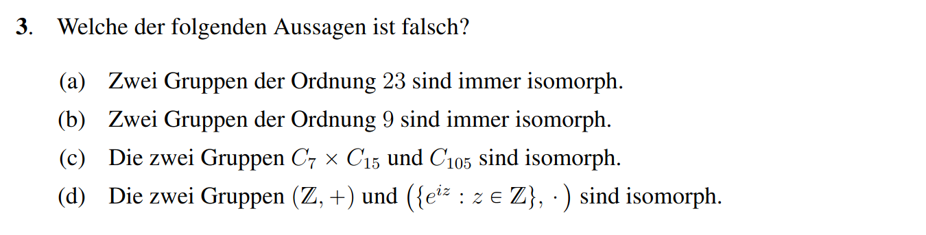 (c) Richtig, die Menge der Matrizen mit Koeffizienten aus , ist die Menge aller Funktionen von . Falls , so besteht die Menge aus genau einem Element. Mit der Leibniz-Formel als Definition der Determinante hat dieses Element Determinante . Somit besteht aus genau einem Element und bildet also eine Gruppe. Im Fall von existieren unendliche viele solche Funktionen bzw. Matrizen, aber nur die 1 Funktion hat Determinante 1. Es folgt, dass wiederrum aus genau einem Element besteht.
