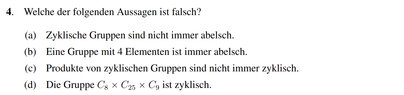 (a) Falsch, nach einer Proposition aus der Übungsstunde ist, falls , jedes Element eine Potenz von . Da mit sich selbst kommutiert, kommutieren alle Elemente.