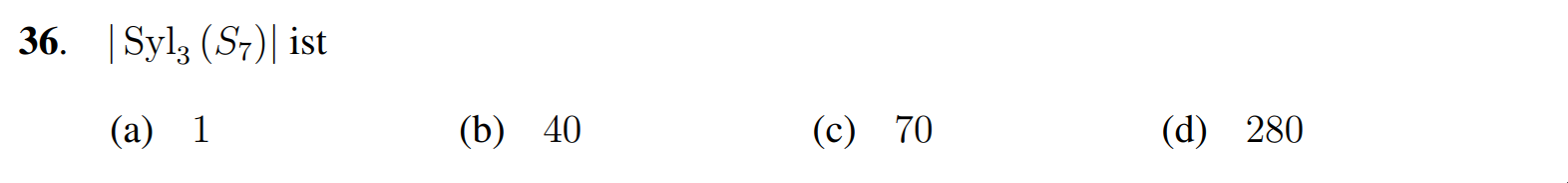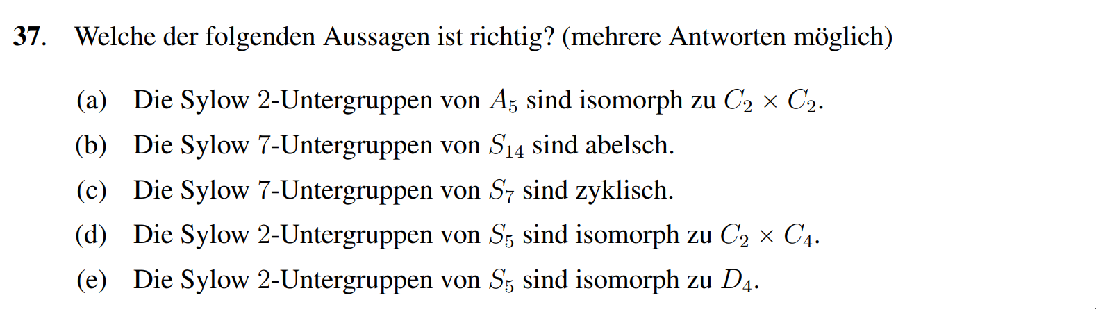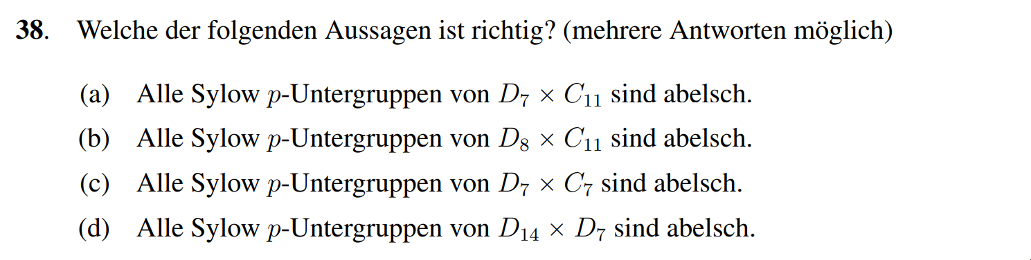 (d) Richtig, wir bemerken . Für ist es klar, da alle Gruppen der Ordnung für prim abelsch sind. Wir müssen nun noch prüfen. Sei eine Sylow 2-Untergruppe von und eine Sylow 2-Untergruppe von . Da diese Ordnunge respektive haben sind diese abelsch. Wir bemerken, dass eine Sylow 2-Untergruppe von ist. Da abelsch ist und alle Sylow -Untergruppen isomorph zueinander sind folgt die Aussage.