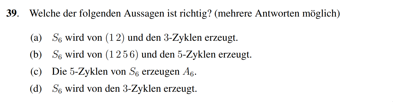 (a) Richtg, wir wissen, dass die 3-Zykel erzeugt. Fügen wir nun noch hinzu, so erhalten wir auch alle ungeraden Permutationen also ganz .