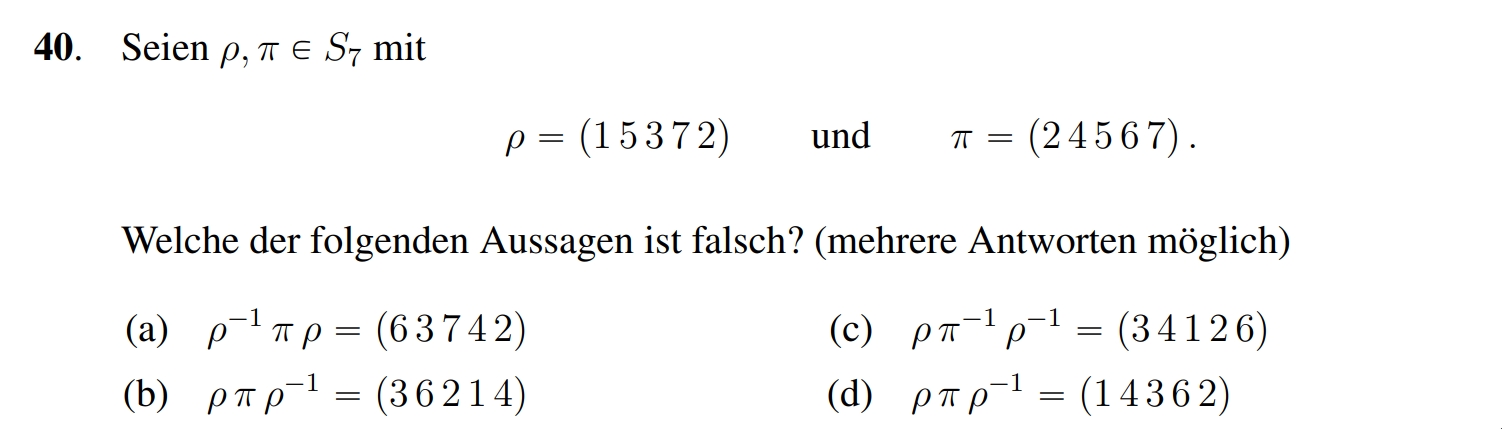 (b) Richtig, wir wollen zuerst das Erzeugnis von allen 5-Zyklen verstehen. Zuerst bemerken wir, dass die Konjugation eines 5-Zykel wieder ein 5-Zykel gibt. Somit ist die Menge alle 5-Zykel invariant unter Konjugation. So gilt aber auch, dass invariant under Konjugation ist, denn . Also gilt . Da die 5-Zykel gerade sind gilt . Da einfach ist folgt . Wenn wir nun die ungerade Permutation noch betrachten, dass erhalten wir zusätzlich noch ungerade Permutationen. Da die grösse echte Untergruppe von ist () folgt .