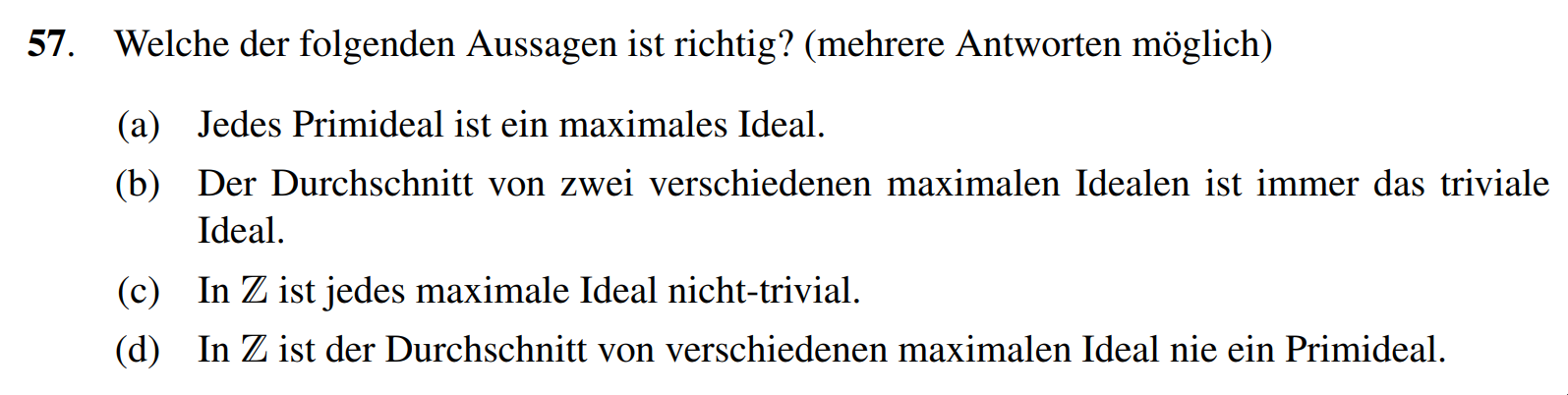 (d) Richtig, wir wissen dass die genau dann ein Körper ist, wenn prim ist. Somit sind für prim genau die maximalen Ideale von . Seien nun zwei verschiedene Primzahlen. Dann gilt und wir sehen, dass aber weder noch liegt in .