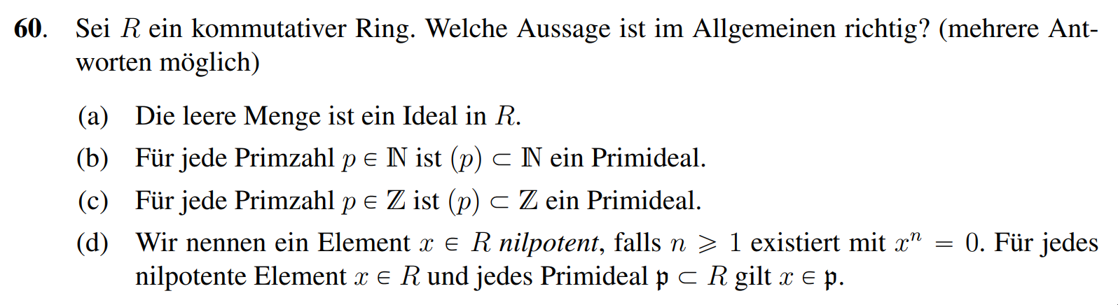 (d) Richtig, sei ein nilpotentes Element und , sodass . Dann gilt , also ist entweder oder . Falls , so sind wir fertig. Falls , dann wiederholen wir das Argument und erhalten, dass oder . Durch ernaute Wiederholung sehen wir, dass spätestens wenn gilt sind wir fertig.