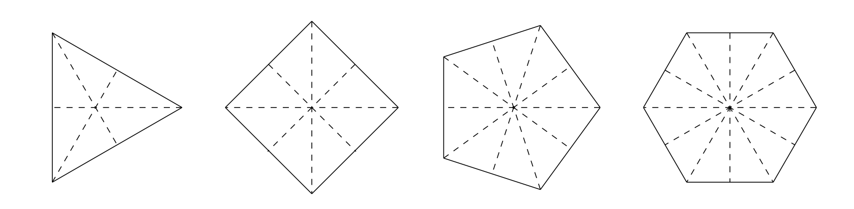 und somit . Diese Definition ist äquivalent zu der geometrischen Definition aus der Vorlesung. Durch obige auflistung der Elemente, sieht man diese äquivalenz relativ gut. Die Elemente entsprechen den Drehungen um und die Elemente entsprechen den Spiegelungen. Im folgender Abbildung sind die Spiegelungen als gestrichelte Linien für die Fälle eingezeichnet.